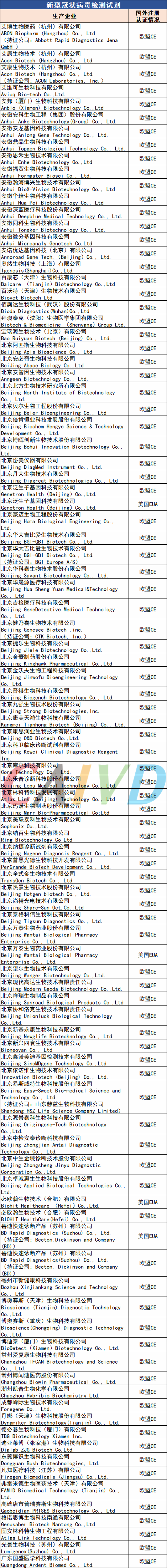 現(xiàn)階段而言,國(guó)內(nèi)雖偶發(fā)小范圍疫情,但防控大體得當(dāng),復(fù)工復(fù)產(chǎn)井然有序進(jìn)行。國(guó)際疫情出現(xiàn)第二波高峰,防疫仍不可松懈,檢測(cè)試劑依然成為疫情防控的重要物資。根據(jù)醫(yī)保商會(huì)更新的取得國(guó)外標(biāo)準(zhǔn)認(rèn)證或注冊(cè)的醫(yī)療物資生產(chǎn)企業(yè)清單顯示,截至目前,有446家生產(chǎn)新冠檢測(cè)試劑企業(yè)取得國(guó)外標(biāo)準(zhǔn)認(rèn)證或注冊(cè),整理如下: