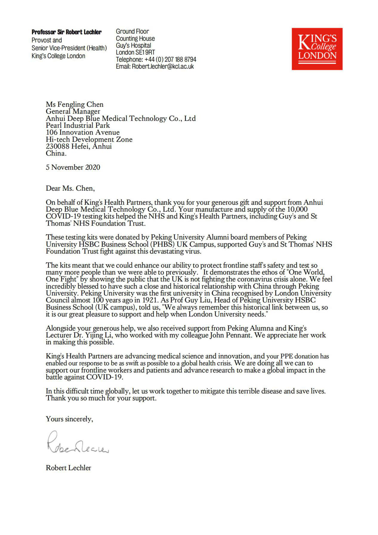 今年3月,深藍(lán)醫(yī)療通過北京大學(xué)匯豐商學(xué)院向倫敦國王學(xué)院捐贈了10000個SARS-CoV-2(IgG/IgM)抗體檢測試劑盒,并收到了英國國王學(xué)院高級副校長 Mr. Robert Lechler的感謝信,信中說:“One World, One Fight”。深藍(lán)醫(yī)療為與英國攜手并肩,共抗疫情而驕傲,更為收到Mr. Robert Lechler的不遠(yuǎn)萬里發(fā)來的感謝信而自豪。