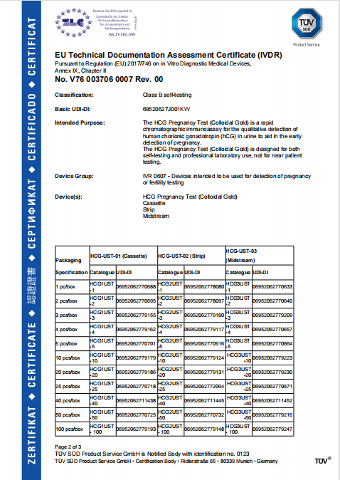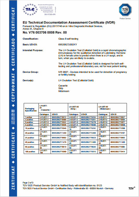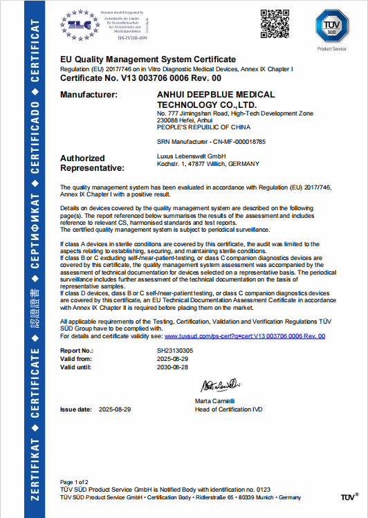 2025年9月3日,安徽深藍醫療科技股份有限公司(以下簡稱深藍醫療)迎來國際化進程中的重要里程碑。由其自主研發的人絨毛膜促性腺激素檢測試劑(HCG)和促黃體生成素檢測試劑(LH)兩個自測產品,正式獲得由TüV SüD 頒發的IVDR質量管理體系證書和 IVDR產品認證證書。這不僅標志著深藍醫療的質量管理體系與產品安全有效性達到了歐盟法規的高標準要求,更是為全球家庭的健康自測開啟了一條全新的便捷通道。